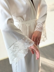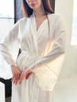 Довгий халат із ніжного шовку — легкий, витончений і дуже жіночний. Модель із широкими рукавами, оздобленими делікатним мереживом, красиво підкреслює лінію рук та додає образу особливого шарму. Ідеальний варіант для ранкової кави, вечірнього релаксу або як розкішне доповнення до домашнього гардеробу.