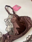 Бюстгальтер на кісточках забезпечує делікатну підтримку, а завищені стрінги підкреслюють жіночність силуету. Поєднання гладкого шовку й ніжного мережива доповнене оригінальною фурнітурою у формі сердечок, що додає образу романтичних акцентів.