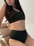 Купальник роздільний у стильному дизайні з акцентом на зручність і трендовий вигляд. Верх виконаний у формі топа з ефектним переплетом на бюсті та застібкою на спинці. Трусики — високі сліпи з широкою резинкою, що гарно підкреслюють талію та забезпечують комфортну посадку.