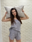 Комплект складається з шортів та майки Виготовлена з м’якого мусліну, що дозволяє шкірі дихати, не парить та не викликає подразнень.